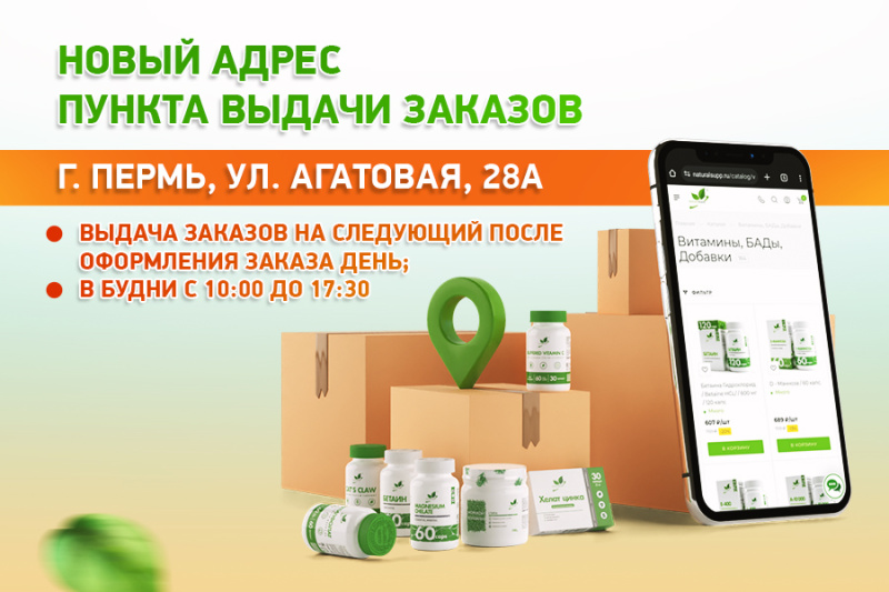 Новый адрес пункта выдачи заказов с 31 января: г. Пермь, ул. Агатовая, 28А (вход со стороны поля). Выдача заказов осуществляется на следующий после оформления заказа день, в будние дни с 10:00 до 17:30 по местному времени. Всю информацию можно уточнить у представителей NaturalSupp любым удобным способом: