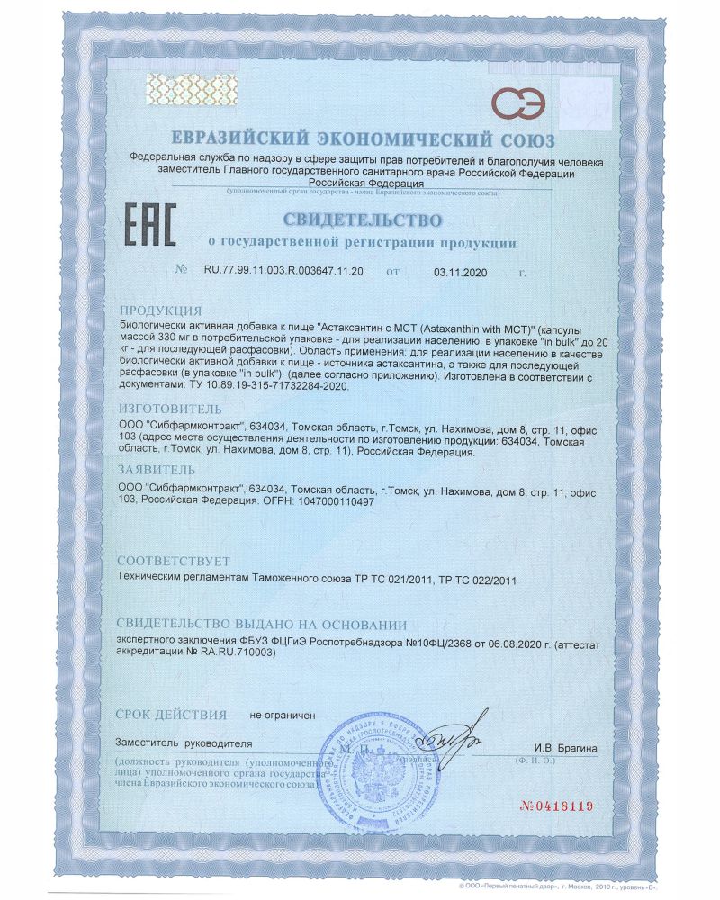 Астаксантин - мощный натуральный антиоксидант выделенный из красной водоросли Haematococcus pluvialis, которая попадая из морских глубин на открытый воздух, быстро меняет свой зеленый цвет на красный, синтезируя окрашенный антиоксидант астаксантин, защищающий ее клетки от свободных радикалов и ультрафиолетовых лучей. Астаксантин мощнее витамина C в 65 раз, витамина Е в 10 раз, бета-каротина в 50 раз. Самое мощное питательное вещество для здоровья глаз. Защищает кожу от UV-лучей.