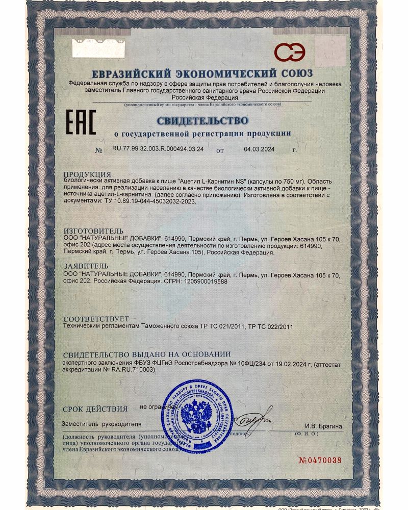 Биологически активная форма L-карнитина, которая способствует производству энергии в клетках и транспортировке жира в митохондрии, где он преобразуется в АТФ (основной источник энергии для клеток).
