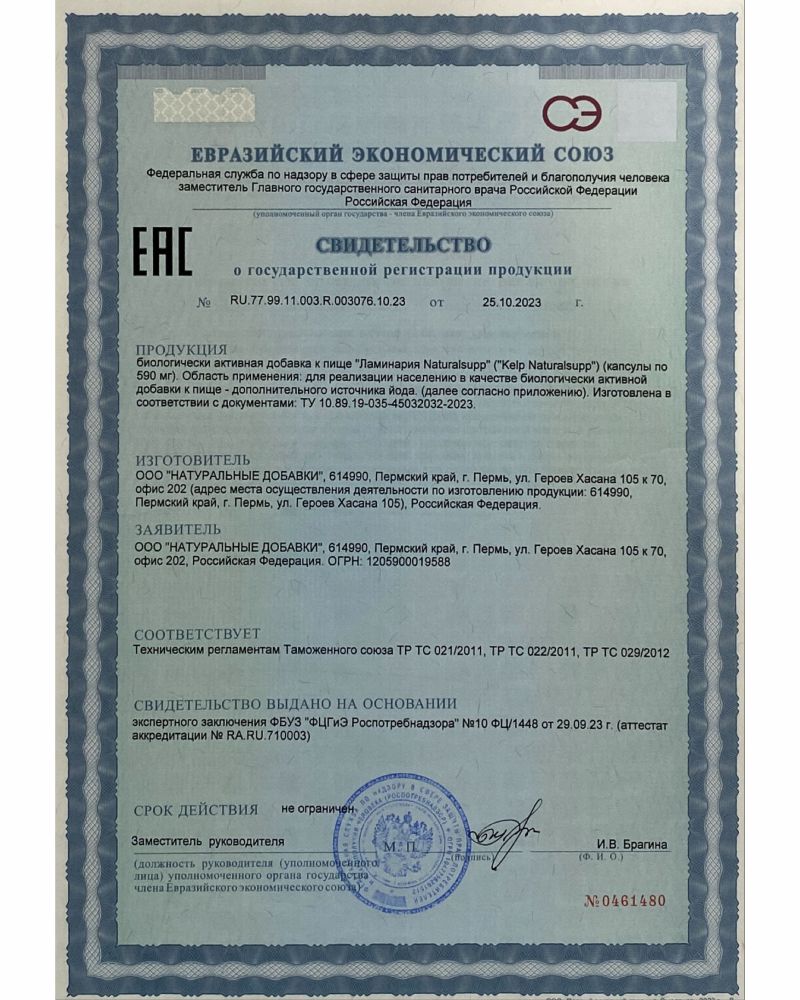 Ламинария (Келп) – органический источник йода из ламинарии (бурой водоросли), содержит большое количество легкоусваиваемого йода. Йод является главным компонентом гормонов щитовидной железы.