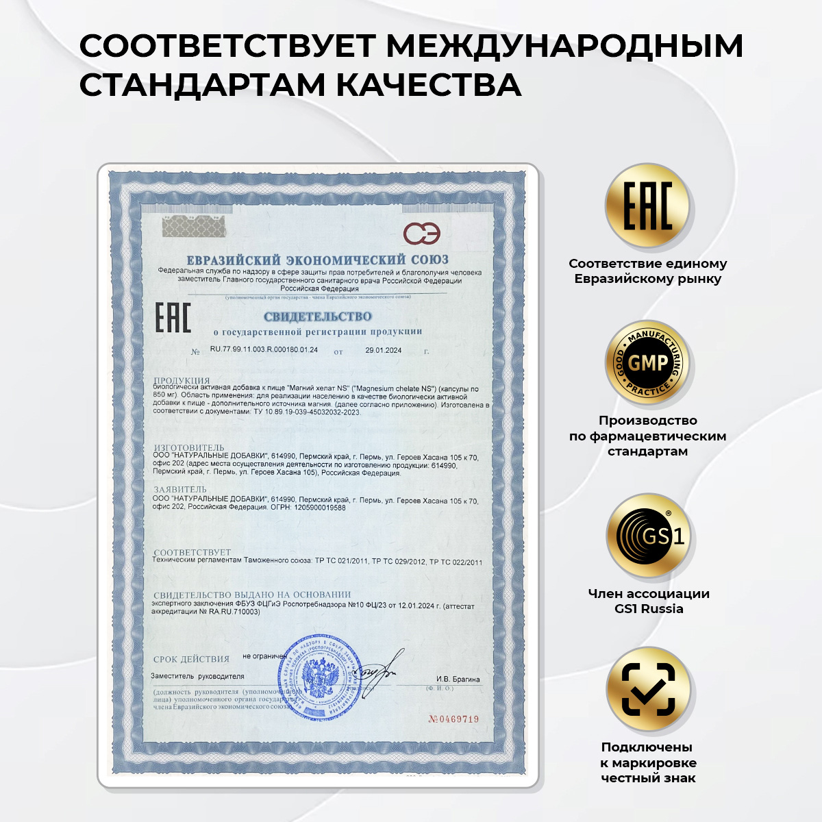 магния хелат (бисглицинат), оболочка капсулы (желатин), диоксид кремния аморфный (антислеживающий агент).