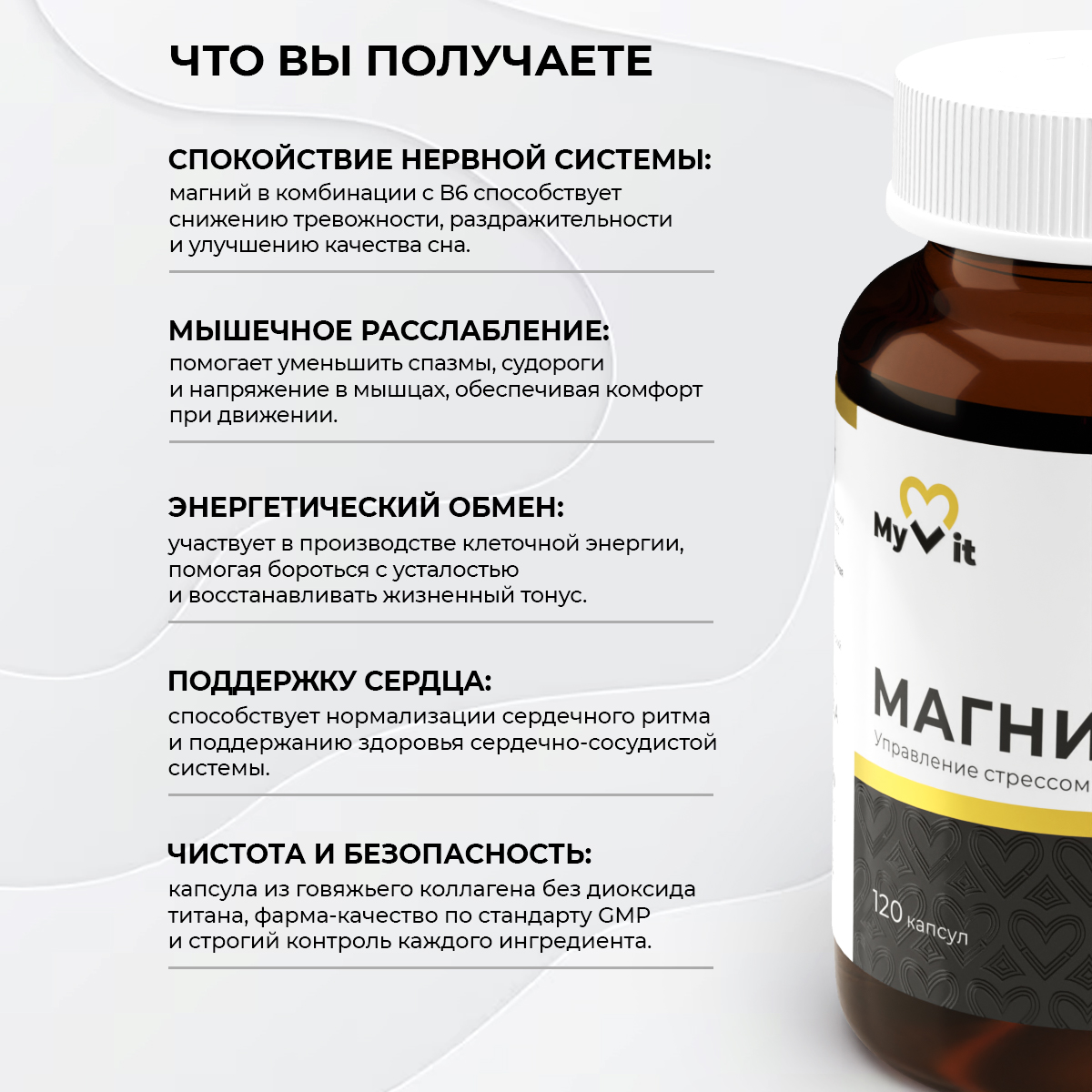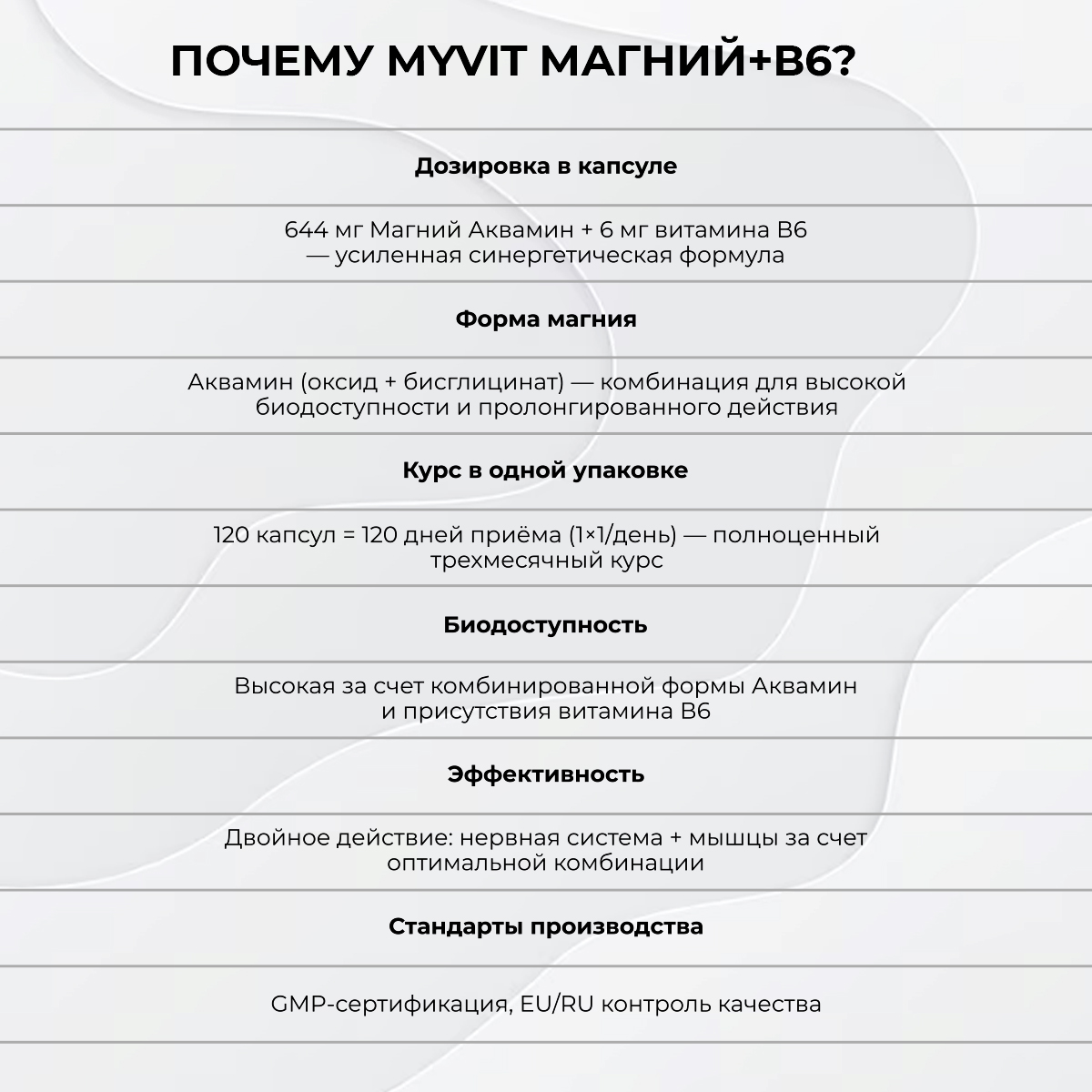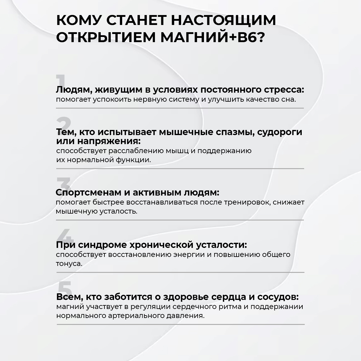 Вывод: Комплекс Магний + В6 является синергичным сочетанием для комплексной поддержки нервной системы, мышечной функции и метаболизма. От регулирования нервных импульсов и борьбы со стрессом до профилактики мигреней и поддержки сердечно-сосудистой системы — этот комплекс особенно важен в периоды повышенных физических и умственных нагрузок, стрессов, а также в подростковом и пожилом возрасте для поддержания оптимального здоровья и качества жизни.