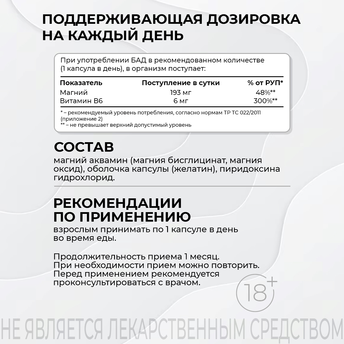 В подростковом возрасте происходит интенсивный рост и гормональная перестройка, что увеличивает потребность в магнии и витамине В6. В пожилом возрасте снижается усвоение этих нутриентов из пищи, а также часто наблюдаются нарушения сна, тревожность и мышечные проблемы. Комплекс помогает компенсировать эти возрастные особенности.
