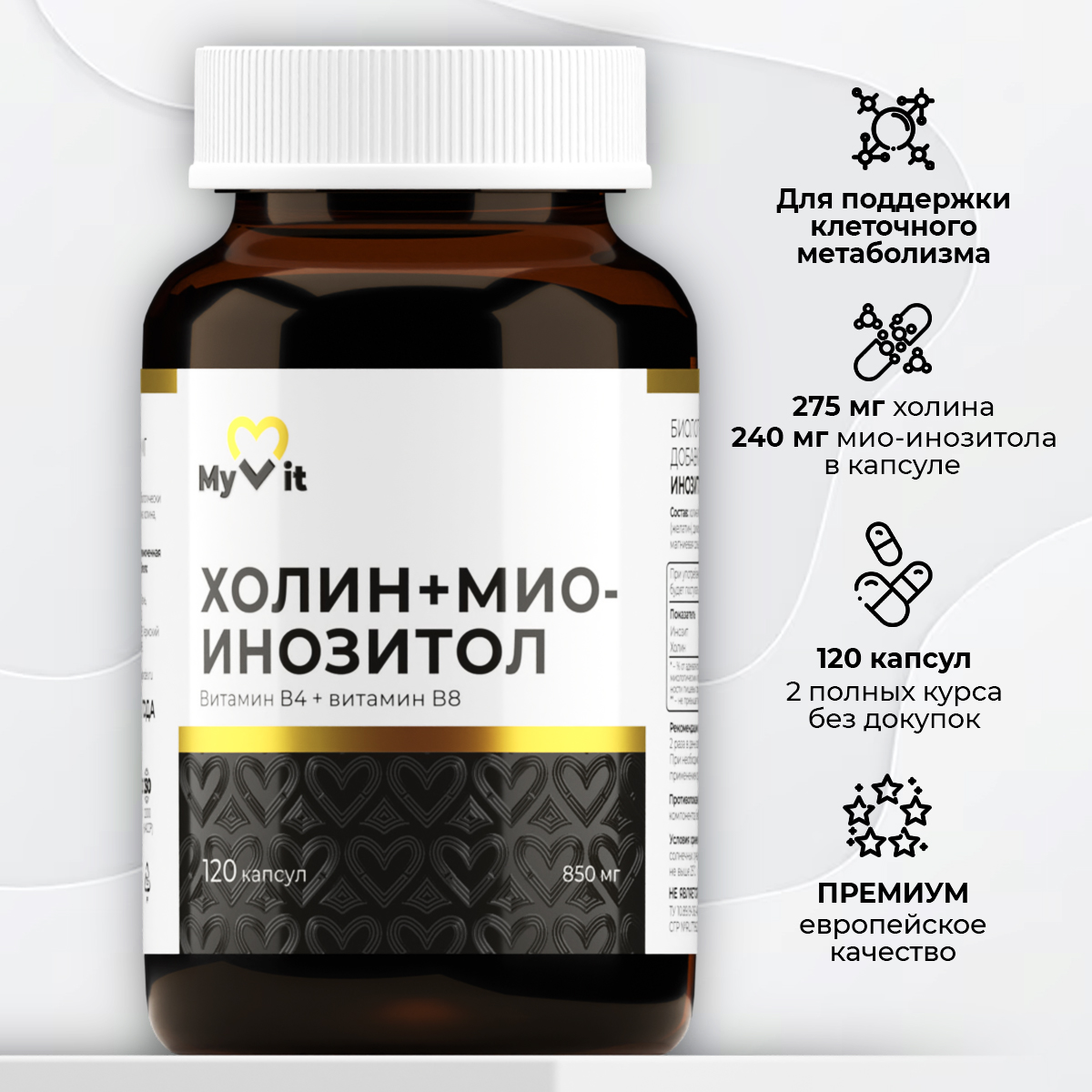 Холин + Мио-Инозитол представляют собой капсулы, содержащие два ключевых витаминоподобных вещества, созданные для комплексной поддержки вашего здоровья. Эти БАДы помогают в улучшении метаболизма и являются эффективными помощниками в процессе похудения.