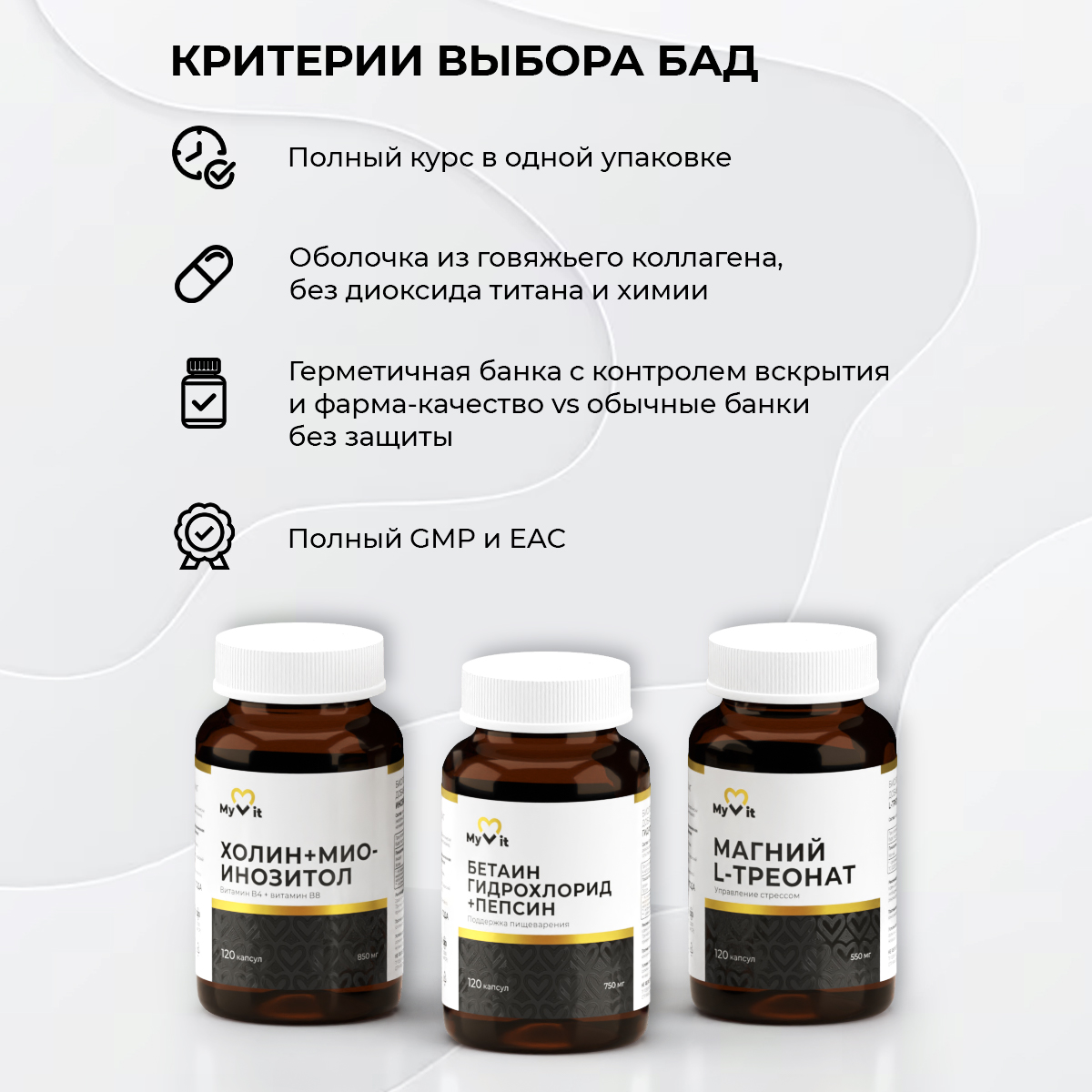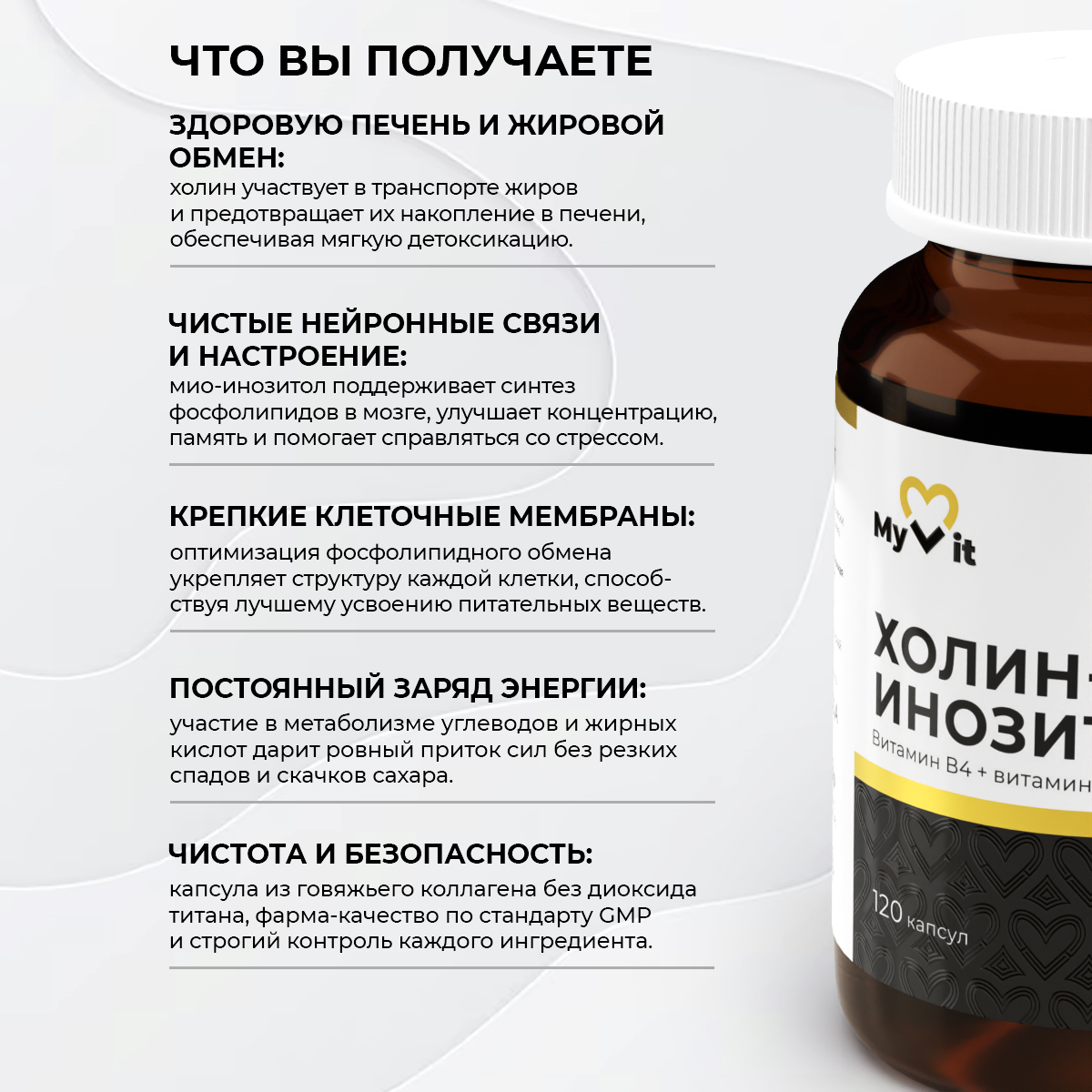 Вывод: Комплекс Холин + Мио-Инозитол — это научно обоснованный тандем, который работает на нескольких фронтах одновременно: ускоряет метаболизм и способствует здоровому похудению, укрепляет нервную систему и повышает стрессоустойчивость, а также поддерживает красоту кожи и волос. Его регулярный прием помогает не только достичь желаемых физических форм, но и сохранить эмоциональное равновесие и хорошее самочувствие на всем пути преобразований, делая этот процесс более гармоничным и эффективным.