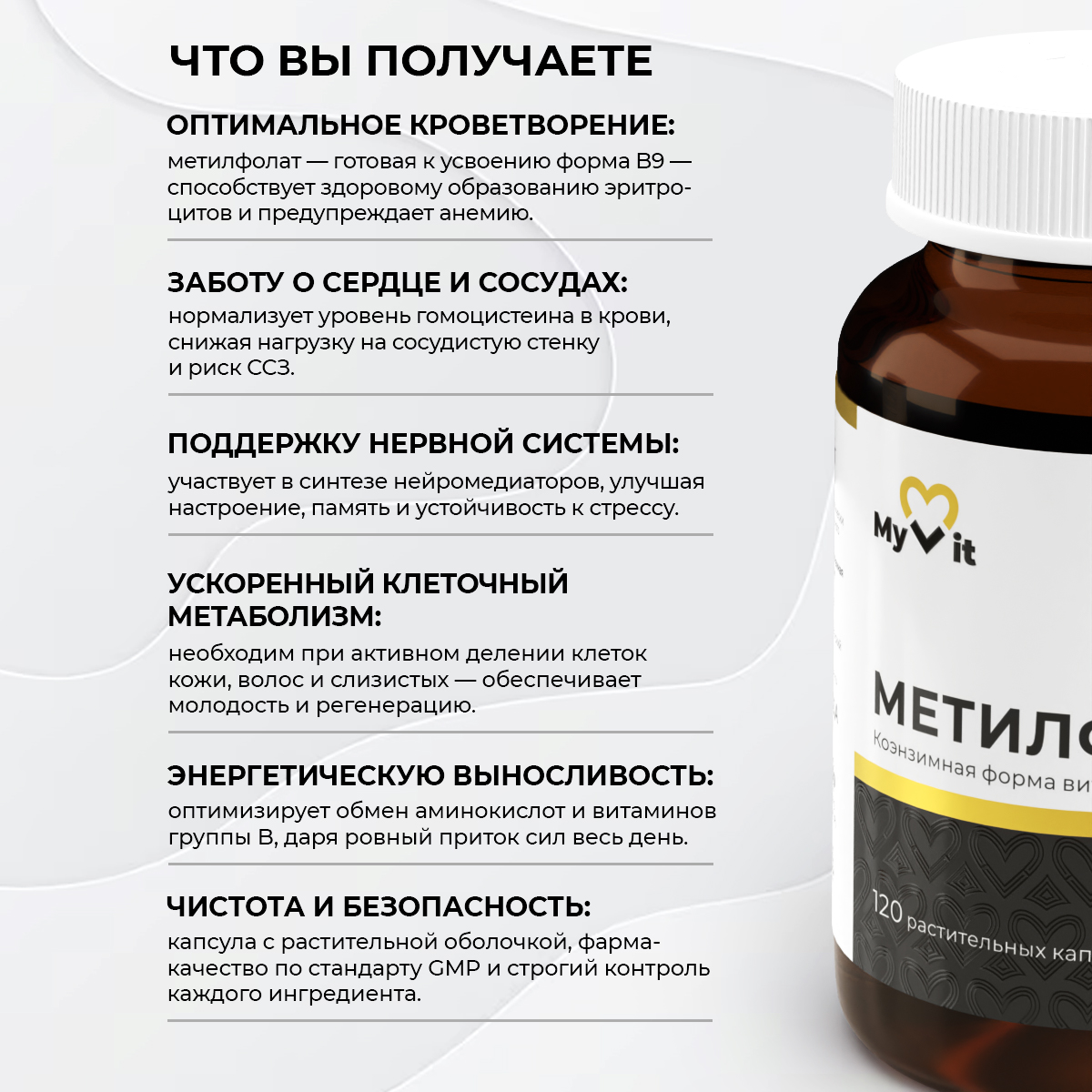 Метилфолат участвует в цикле метилирования - ключевом процессе энергетического обмена, синтеза ДНК и детоксикации. Это способствует поддержанию энергетического уровня и общего тонуса организма.
