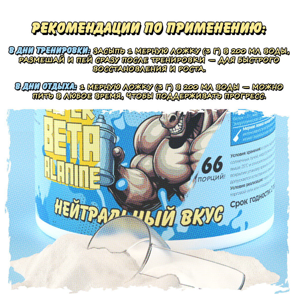 Рекомендации по применению: взрослым 1/2 мерной ложки (3 г) продукта растворить в 250-500 мл воды, при интенсивном встряхивании. Употреблять до, во время и после периода высокой физической активности.