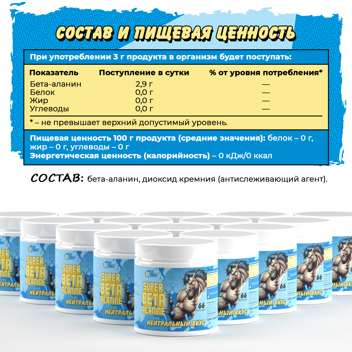 бета-аланин, диоксид кремния (антислеживающий агент).