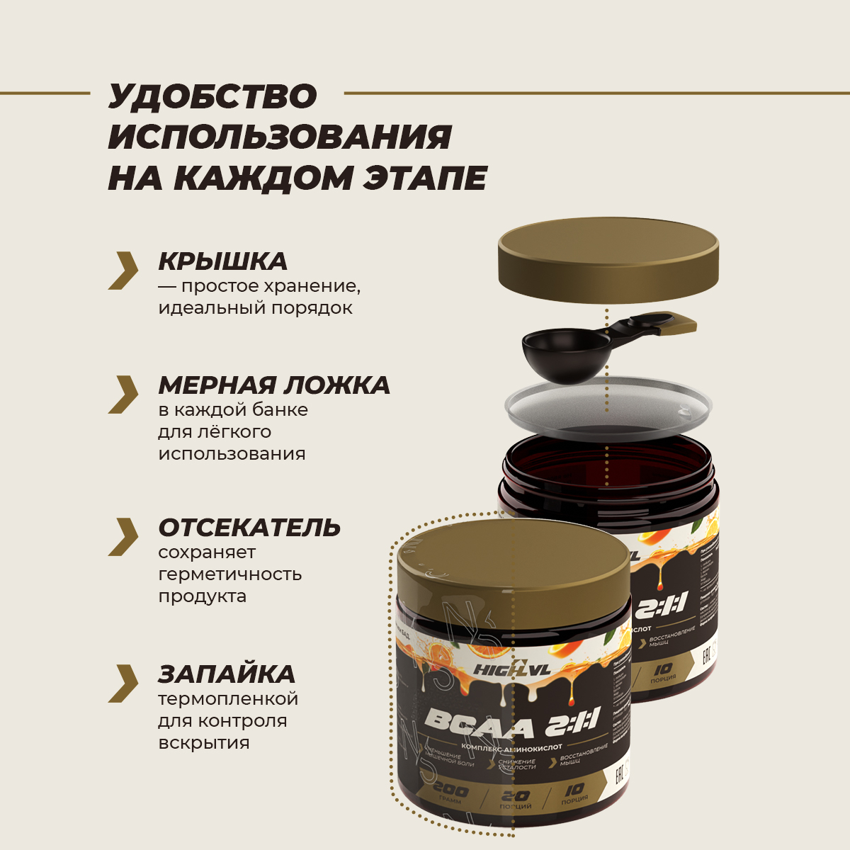 HIGHLVL – российский бренд премиум-класса, предлагающий продукты с чистым составом и без лишних добавок. ВСАА 2:1:1 стимулирует синтез белка, ускоряет восстановление и помогает улучшить выносливость. Продукт станет отличным дополнением к вашему спортивному питанию, будь то предтренировочный комплекс или посттренировочный восстановительный продукт.