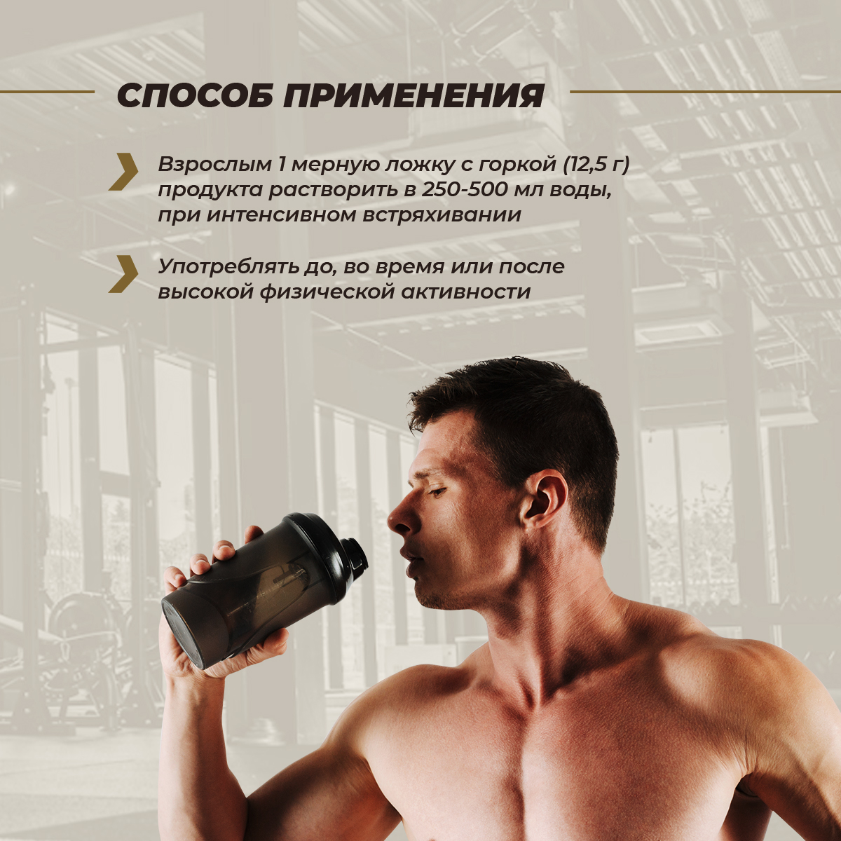 Рекомендации по применению: взрослым 1 мерную ложку с горкой (12,5 г) продукта растворить в 250-500 мл воды, при интенсивном встряхивании. Употреблять до, во время или после высокой физической активности.