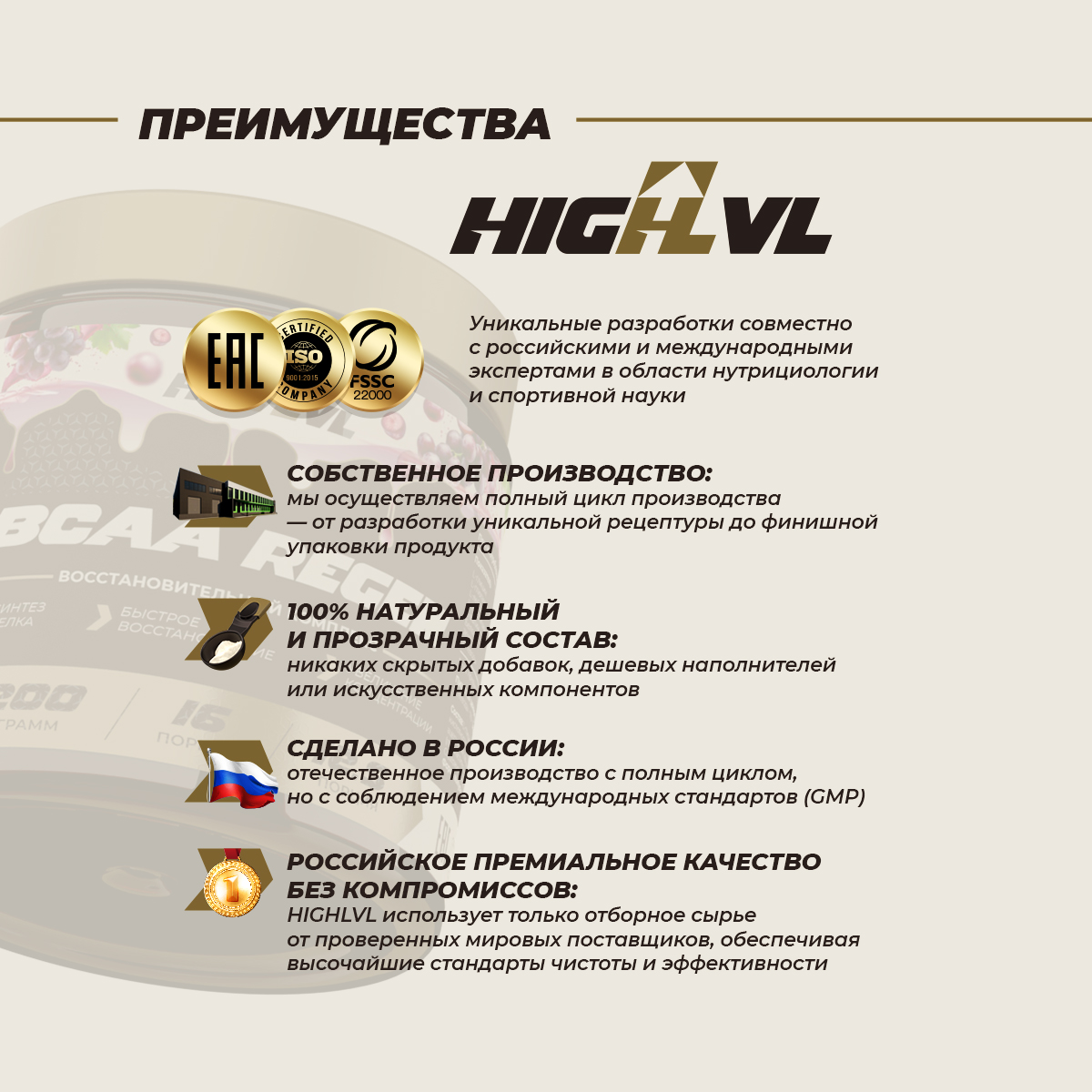 <i>Сухая смесь для приготовления напитка «ВСАА восстановительный комплекс», выпускаемая ООО «Спортивные добавки», является источником аминокислот . Благодаря тщательно подобранным ингредиентам и их оптимальному количеству, продукт сочетает в себе высокую биологическую ценность, хорошую биодоступность активных компонентов, приятный вкус и аромат. Данный продукт помогает ускорить восстановление мышц, снизить утомляемость, уменьшить риск мышечных повреждений и обеспечить организм необходимыми аминокислотами для поддержания и роста мышечной массы. Использование этого комплекса способствует более эффективной подготовке к следующим тренировкам и у</i>