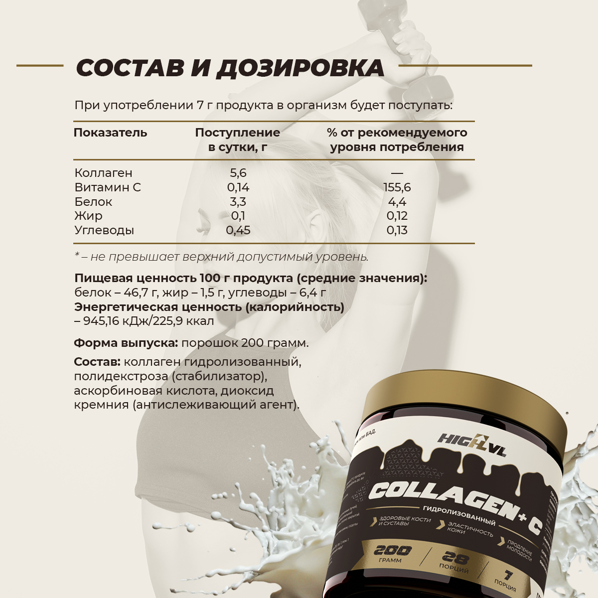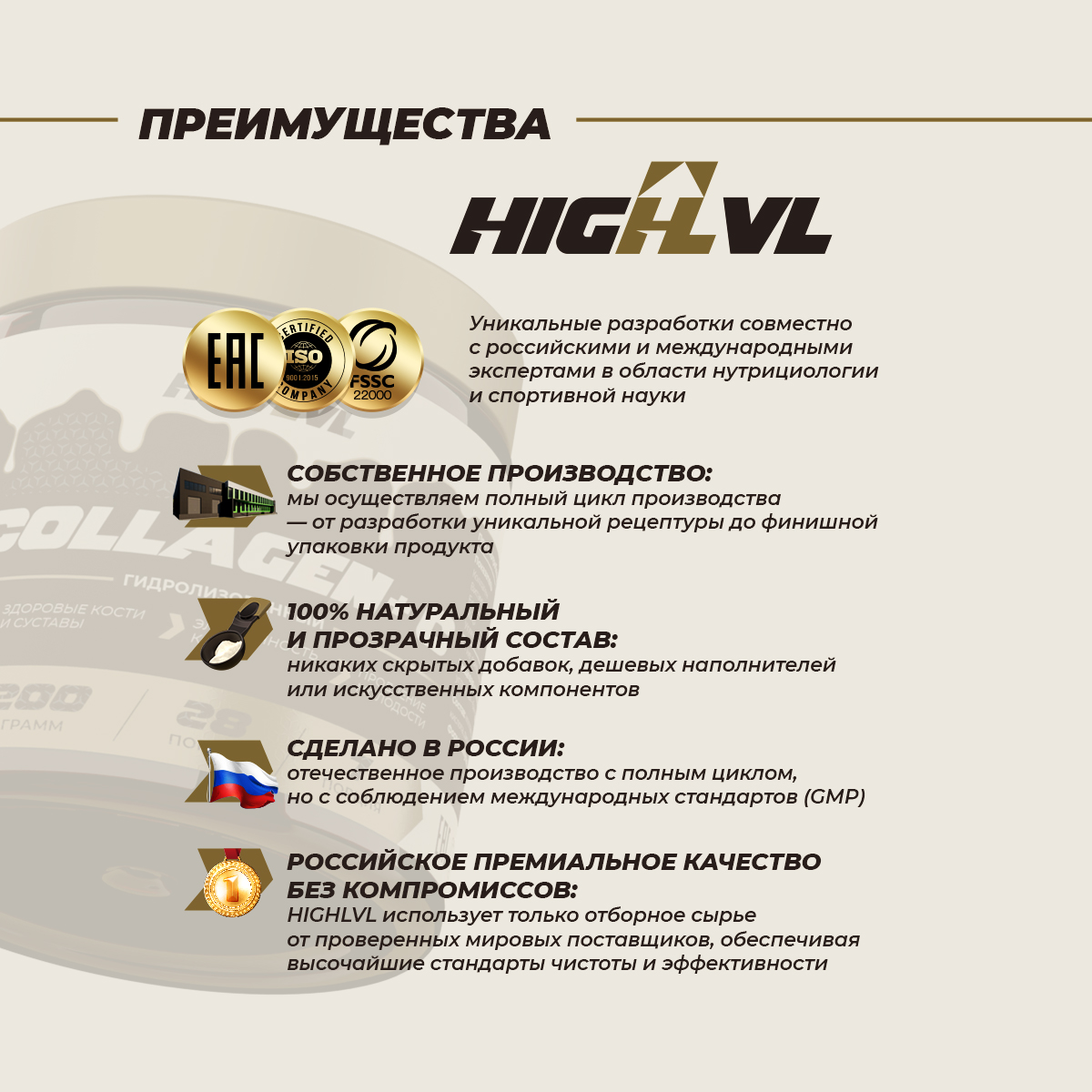HIGHLVL — российский бренд премиум-класса, который сочетает высокое качество с доступной ценой. Мы используем чистые и научно обоснованные компоненты без лишних добавок и химии. Данная добавка является отличным выбором как для мужчин, так и для женщин, которые хотят поддержать суставы, улучшить состояние кожи и укрепить волосы.