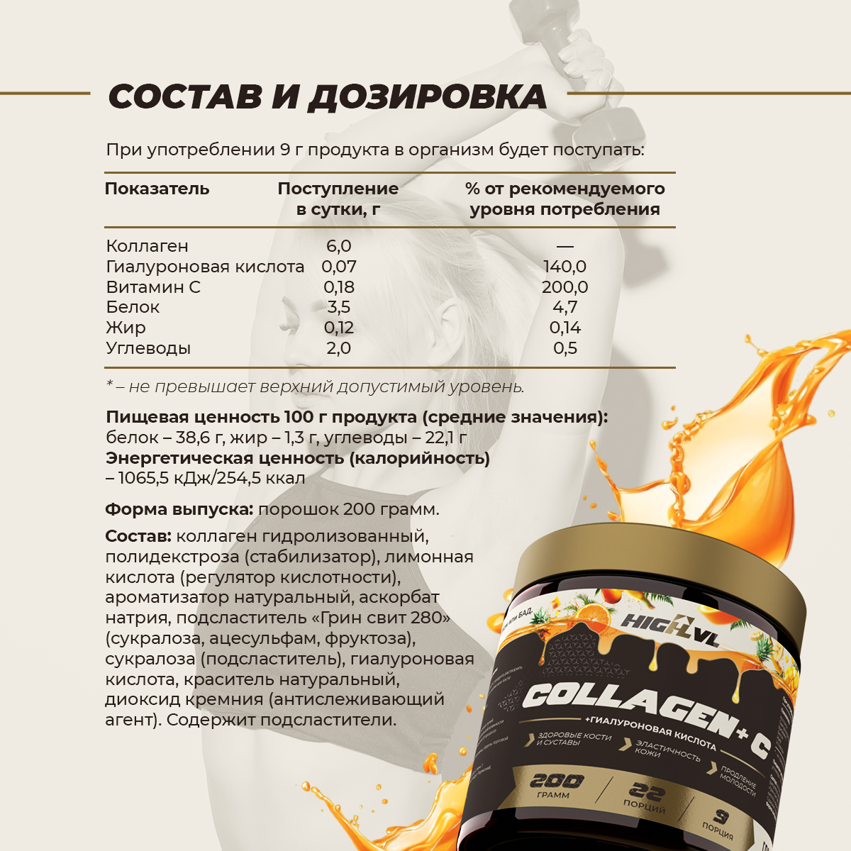 COLLAGEN + C от HIGHLVL со вкусом тропических фруктов — это высококачественная добавка, созданная для поддержания здоровья суставов, улучшения состояния кожи и укрепления волос. Сочетание гидролизованного коллагена, гиалуроновой кислоты и витамина C помогает восстановить упругость кожи, уменьшить воспаления в суставах и поддерживать здоровье волос. Эта формула идеально подходит для людей, заботящихся о своем внешнем виде и физическом состоянии.