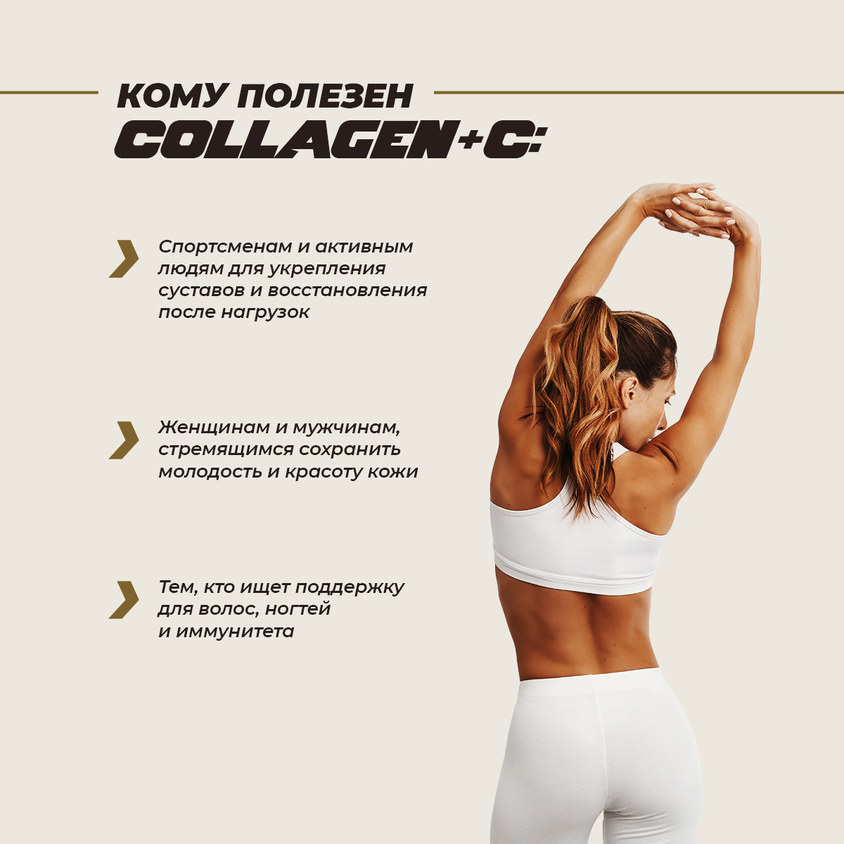 Витамин C в составе способствует выработке коллагена, а гиалуроновая кислота помогает улучшить гидратацию кожи и подвижность суставов. Регулярное применение COLLAGEN + C способствует уменьшению видимых признаков старения, улучшает эластичность кожи и ускоряет восстановление после физической нагрузки. Коллаген, основной компонент продукта, поддерживает прочность костей и суставов, что особенно важно для людей, ведущих активный образ жизни или занимающихся спортом.