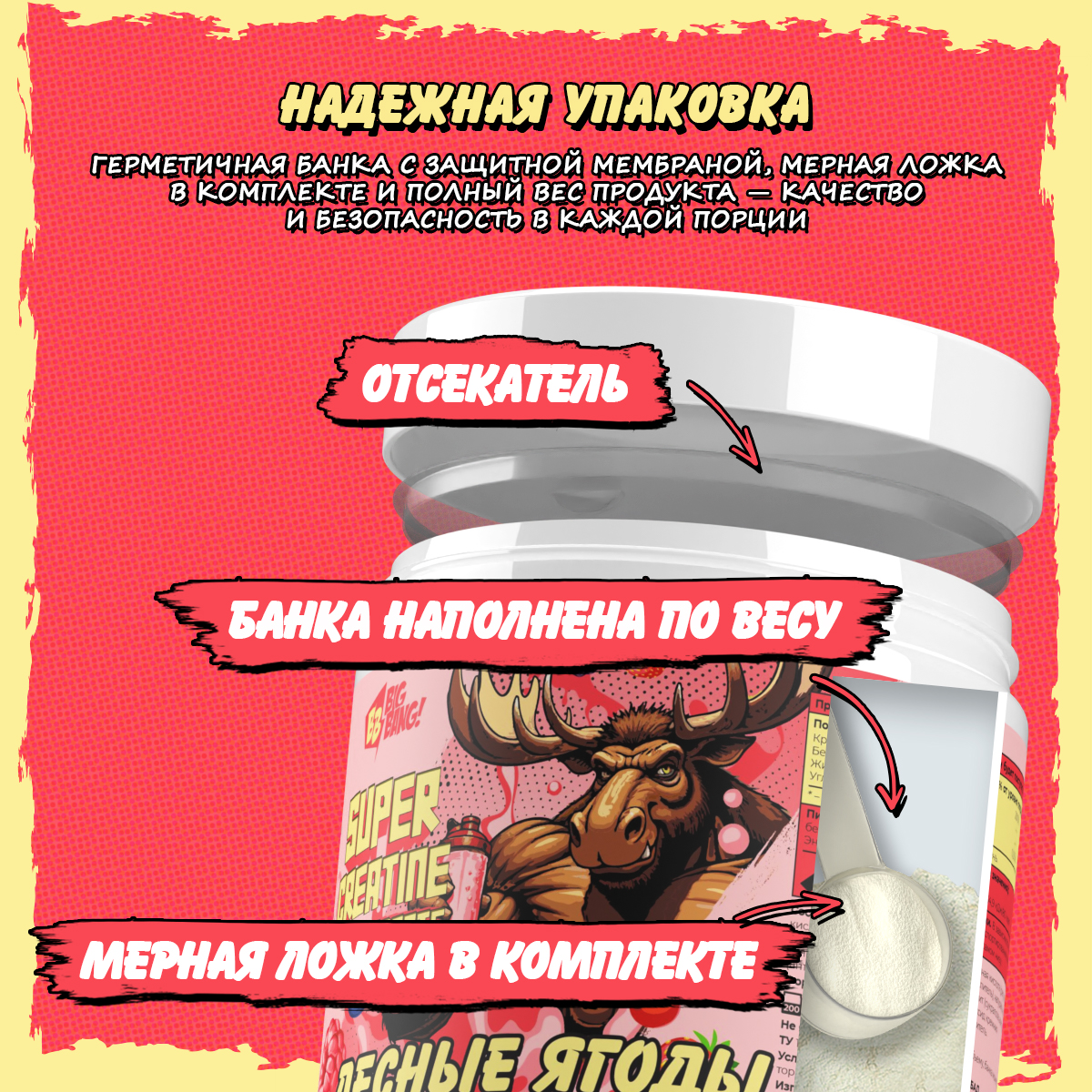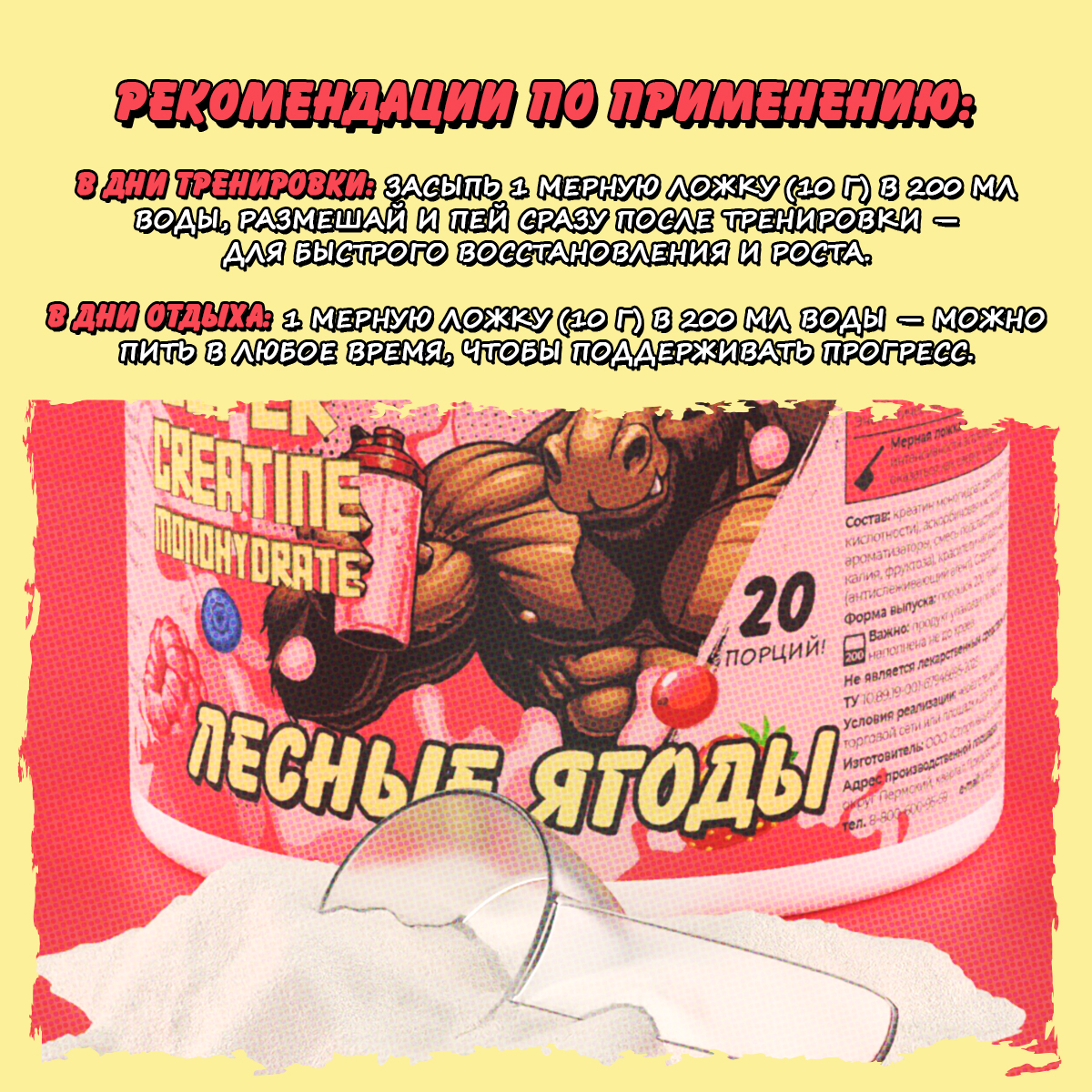 креатин моногидрат, декстроза, лимонная кислота (регулятор кислотности), аскорбиновая кислота (антиокислитель), натуральные ароматизаторы, смесь подсластителей грин свит (сукралоза, ацесульфам калия, фруктоза), красители натуральные, диоксид кремния (антислеживающий агент). Содержит подсластитель.