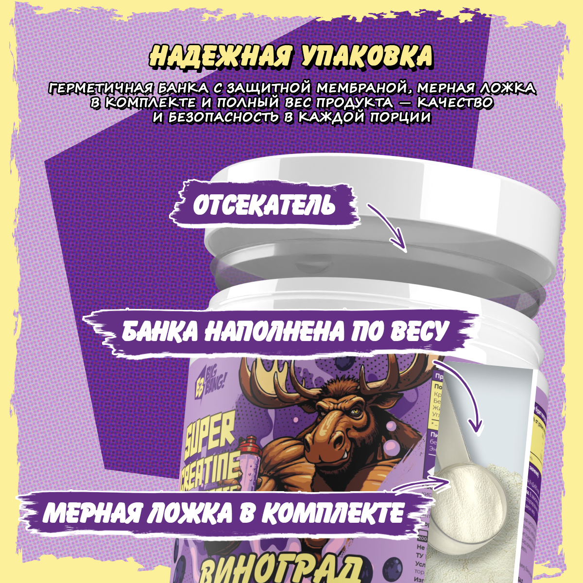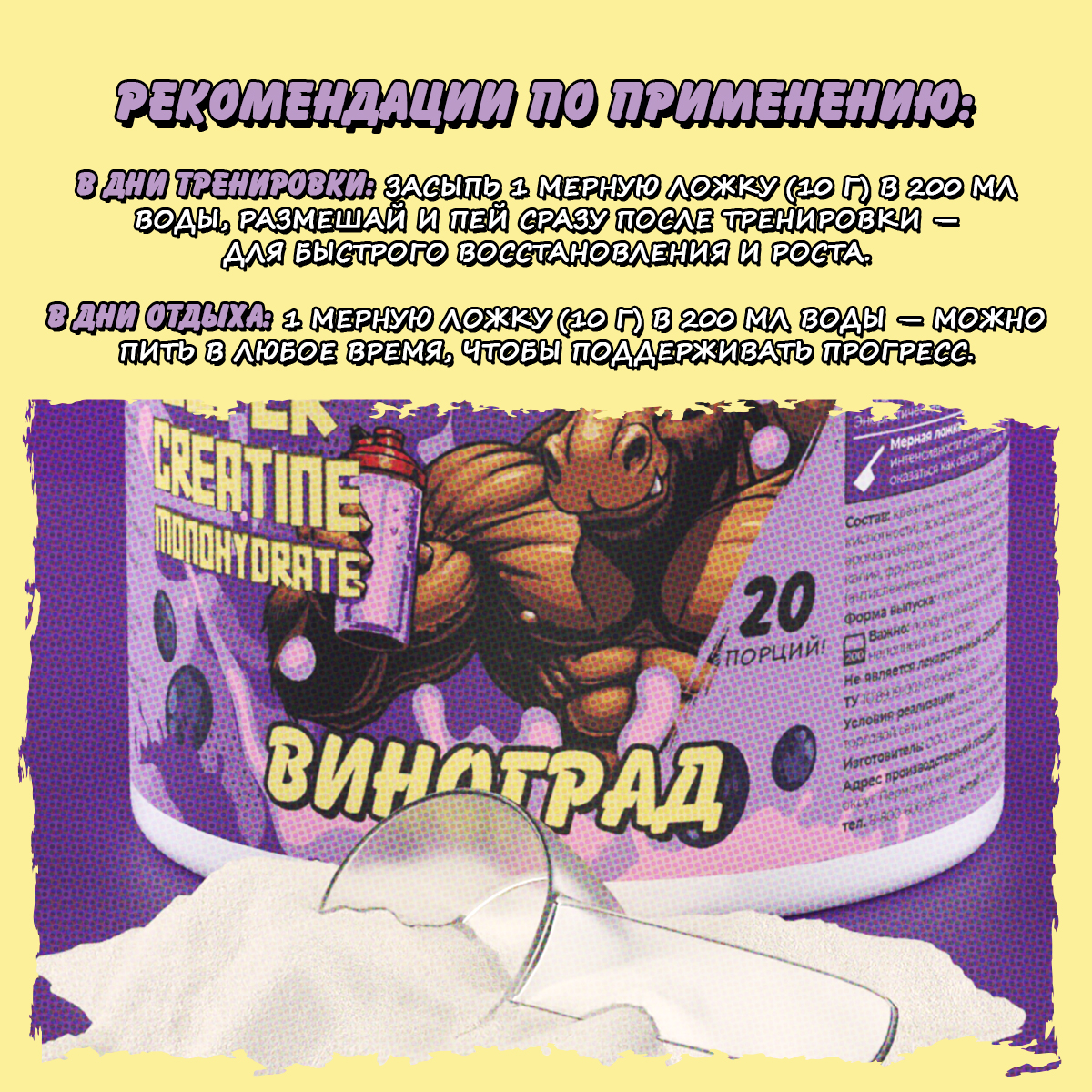Креатин со вкусом винограда - это популярная добавка среди спортсменов. Это эффективное средство для наращивания мышечной массы. Порошок легко смешивается с напитками. Виноградный вкус делает его оригинальным и приятным в использовании. Этот продукт представляет собой чистый моногидрат креатина. Он способствует улучшению спортивных результатов и увеличению силы в тренажерном зале. Креатин поддерживает процессы восстановления, что важно для тренировок высокой интенсивности. Также это отличное решение для похудения. Эффективные ингредиенты помогут вам достичь поставленных целей в краткие сроки. Такой комплекс способен поддерживать уровень энергии во время физических нагрузок. Подарочный вариант станет отличным сюрпризом для друга или близкого человека, увлекающегося спортом. Такой подарок подчеркнёт ваше внимание и заботу о здоровье получателя. Для максимальной эффективности используйте комбинацию с белковыми коктейлями или другими спортивными добавками. Это позволит повысить результативность тренировочного процесса и восстановление мышц после упражнений. Здоровое питание важно для любого спортсмена. Фокусируйтесь на полезных продуктах, соблюдая принцип правильного питания (ПП). Порошковая форма делает его удобным для применения в повседневной жизни. Добавьте этот товар в свой рацион и укрепите свои мышцы без лишних усилий. Спортивные смеси идеально подходят для тех, кто стремится улучшить свою физическую форму и увеличить вес при минимальных вложениях времени. Выбирая данную добавку, вы получаете поддержку на всех этапах тренировочного процесса. Профессиональные спортсмены доверяют ей за её пользу и эффективность в достижении поставленных целей.