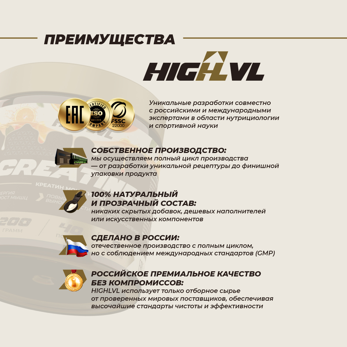 Сухая смесь для приготовления напитка «Креатин + витамин С», выпускаемая ООО «Спортивные добавки», является источником креатина и витамина С. Благодаря тщательно подобранным ингредиентам и их оптимальному количеству, продукт сочетает в себе высокую биологическую ценность, хорошую биодоступность активных компонентов, приятный вкус и аромат.