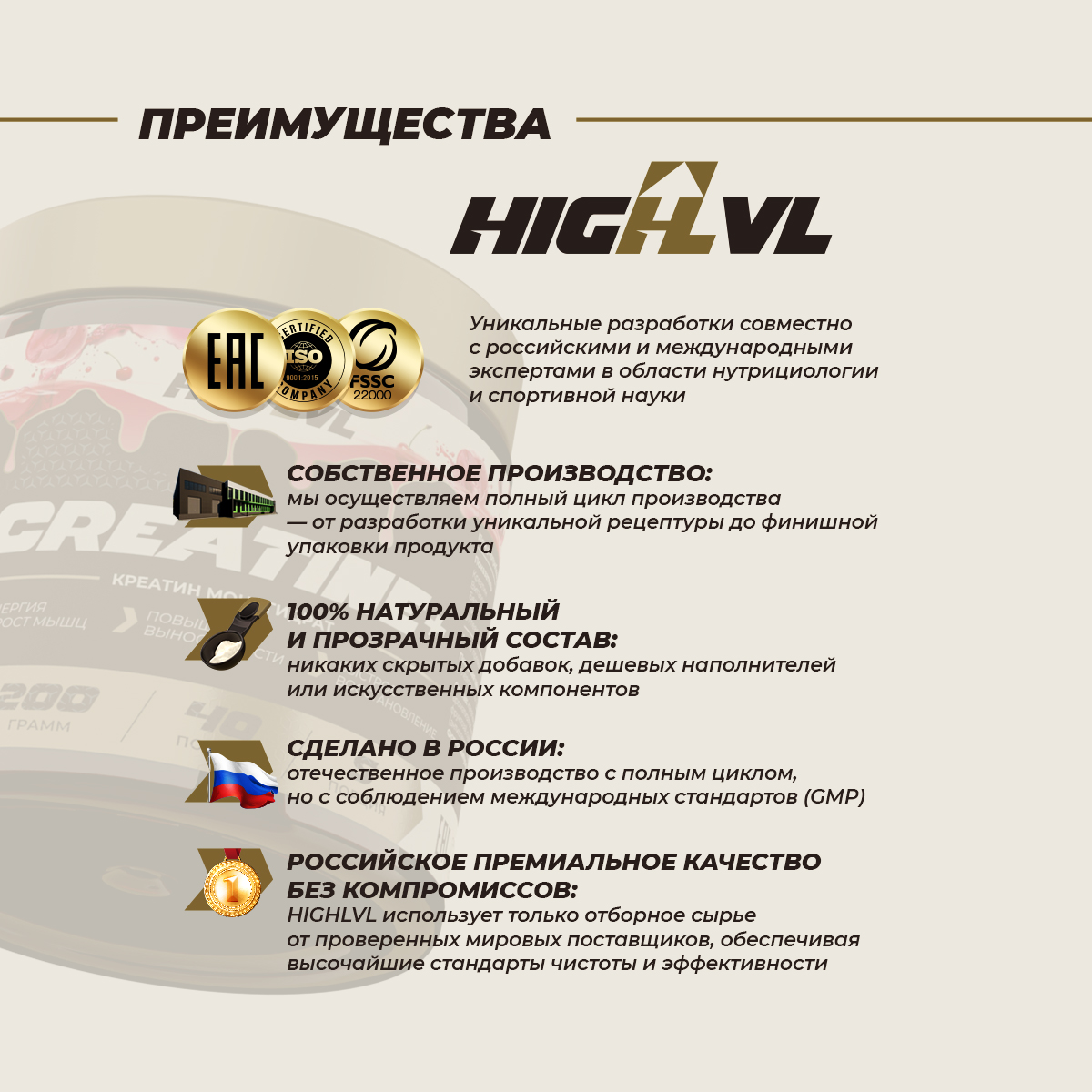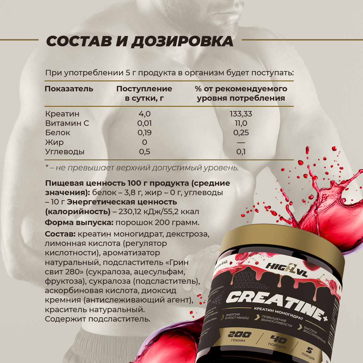 Сухая смесь для приготовления напитка «Креатин + витамин С», выпускаемая ООО «Спортивные добавки», является источником креатина и витамина С. Благодаря тщательно подобранным ингредиентам и их оптимальному количеству, продукт сочетает в себе высокую биологическую ценность, хорошую биодоступность активных компонентов, приятный вкус и аромат.