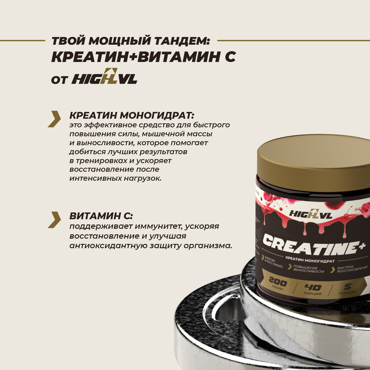Сочетание креатина с витамином С способствует улучшению метаболизма и усвоения креатина в мышцах, что повышает его эффективность, также способствует более быстрому восстановлению после тренировки.