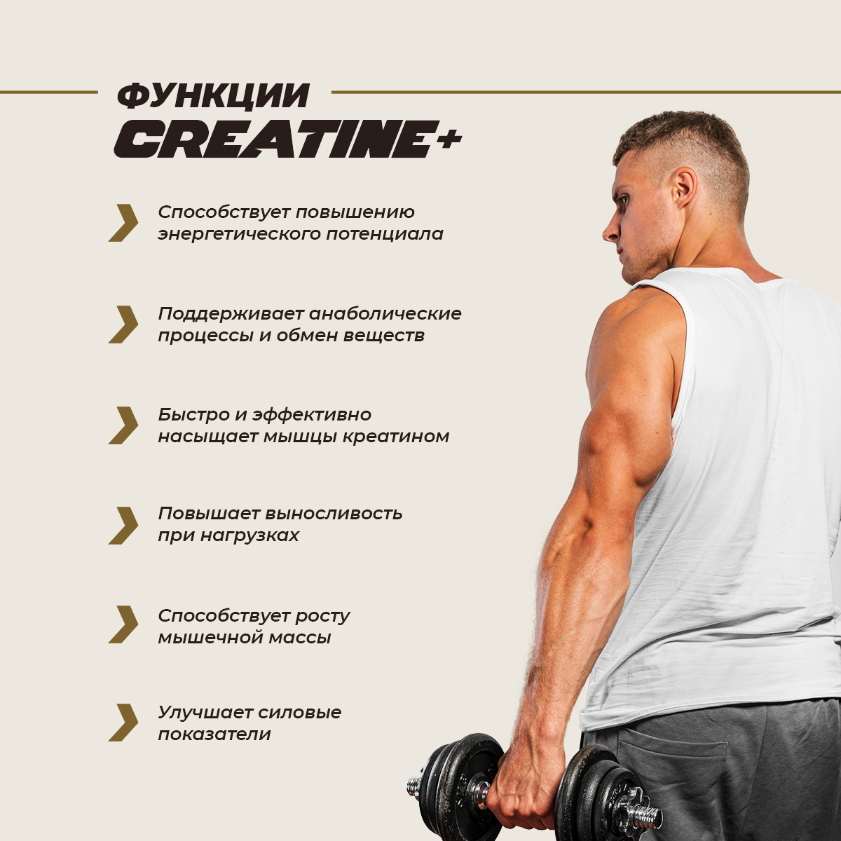 Креатин увеличивает содержание фосфокреатина в мышечных клетках, что улучшает способность мышц быстро восстанавливаться и работать при высоких нагрузках. Это позволяет тренироваться интенсивнее и дольше, что в свою очередь стимулирует мышечный рост.